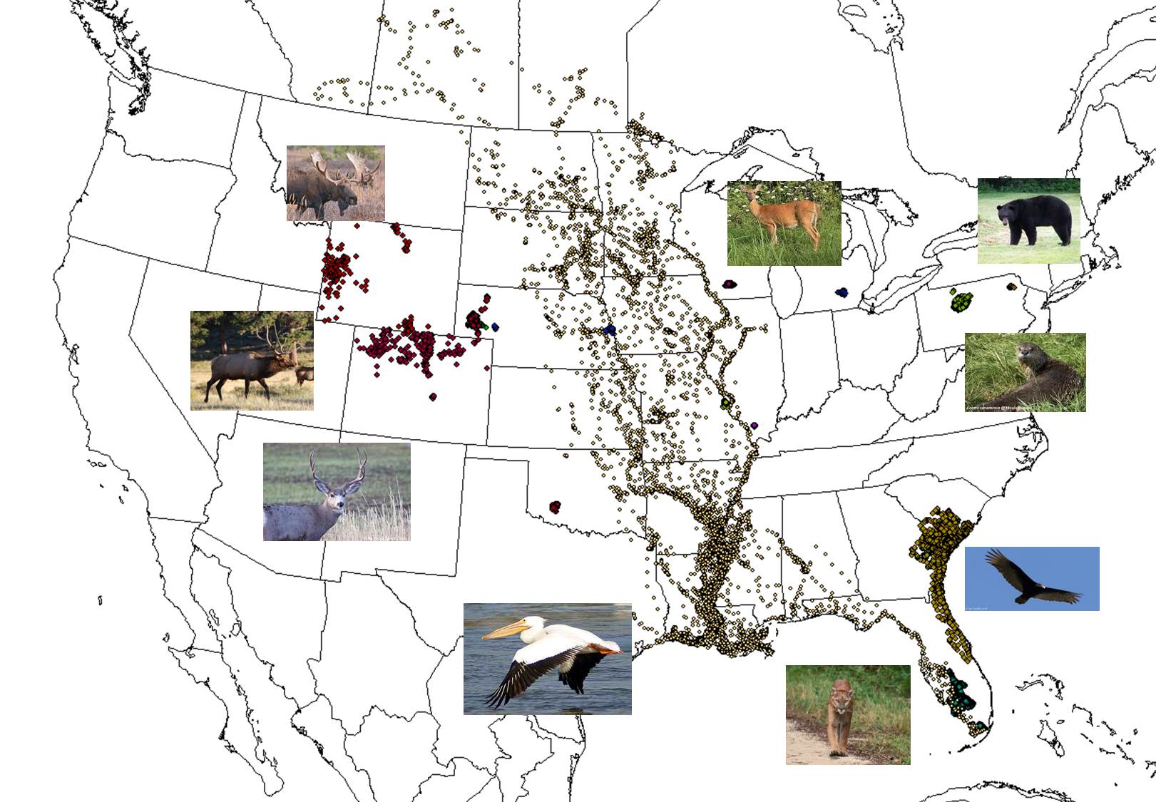 Currently, we have 474,919 locations encompassing 5 mammalian species and 3 avian species equipped with GPS technology and 2 species collected during surveillance studies for disease/harvest. The datasets compiled are from 9 states in the US with collaborations from 7 Universities, 6 state wildlife management agencies, and 2 federal agencies.